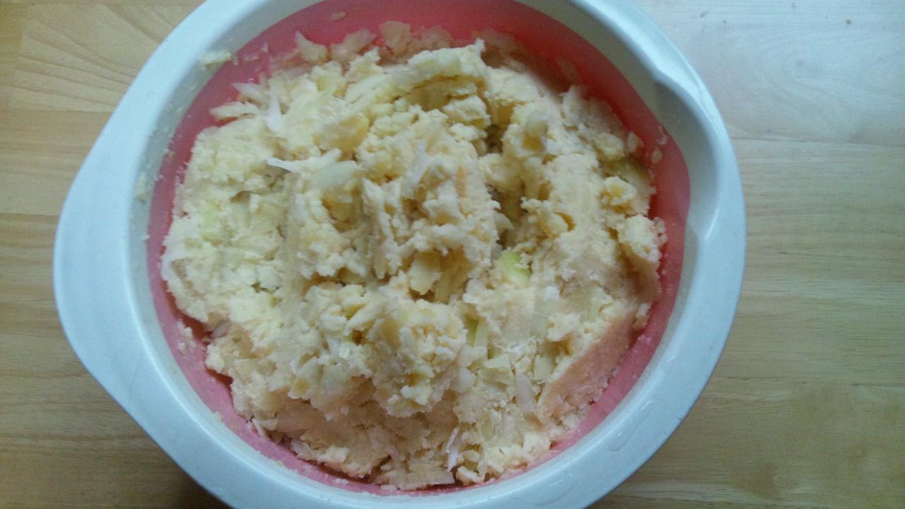 茹でてつぶしたジャガイモとみじん切りの玉ねぎ、酢とマヨネーズ。さらに、おからを混ぜてみました。